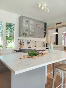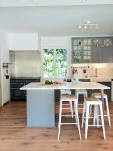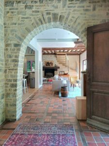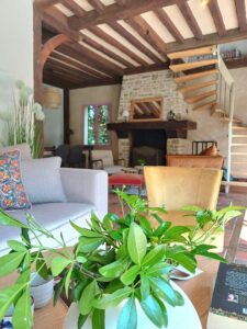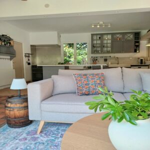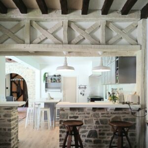 Notre priorité était de conserver l’âme et le charme de cette belle bâtisse, en respectant son histoire et son environnement unique. Avec les propriétaires, nous avons travaillé dans une dynamique d’économie circulaire. Nous restaurons et recyclons tout ce que nous pouvons pour donner une seconde vie aux matériaux existants. Nous avons rénové entièrement la cuisine pour qu’elle soit plus fonctionnelle et chaleureuse. Coté salon, les couleurs chaudes et accueillantes du mobilier apportent une touche de convivialité et de confort.