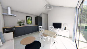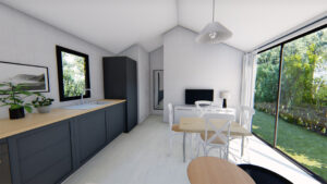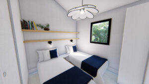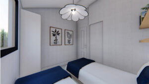 Le mobilier classique et les pièces lumineuses renforcent le style minimaliste de type « cabane de plage », rendant hommage au bois blanc lasuré. Ce style vise à éliminer le superflu pour ne conserver que l’essentiel, favorisant un espace épuré et fonctionnel. Dans les chambres, une touche de couleur bleu marine est ajoutée, évoquant la mer et complétant harmonieusement le thème maritime de l’ensemble.